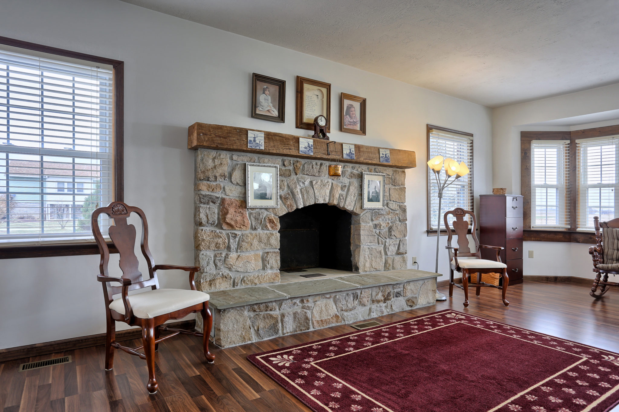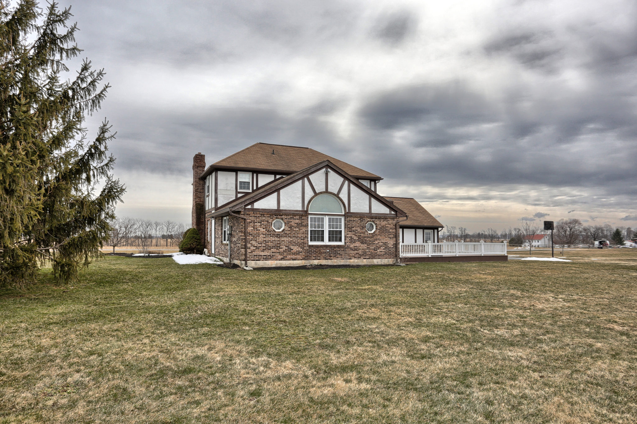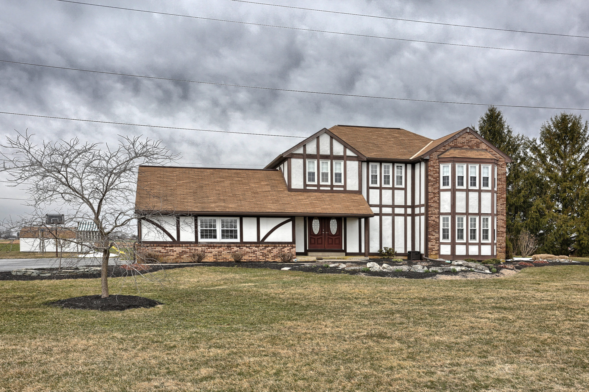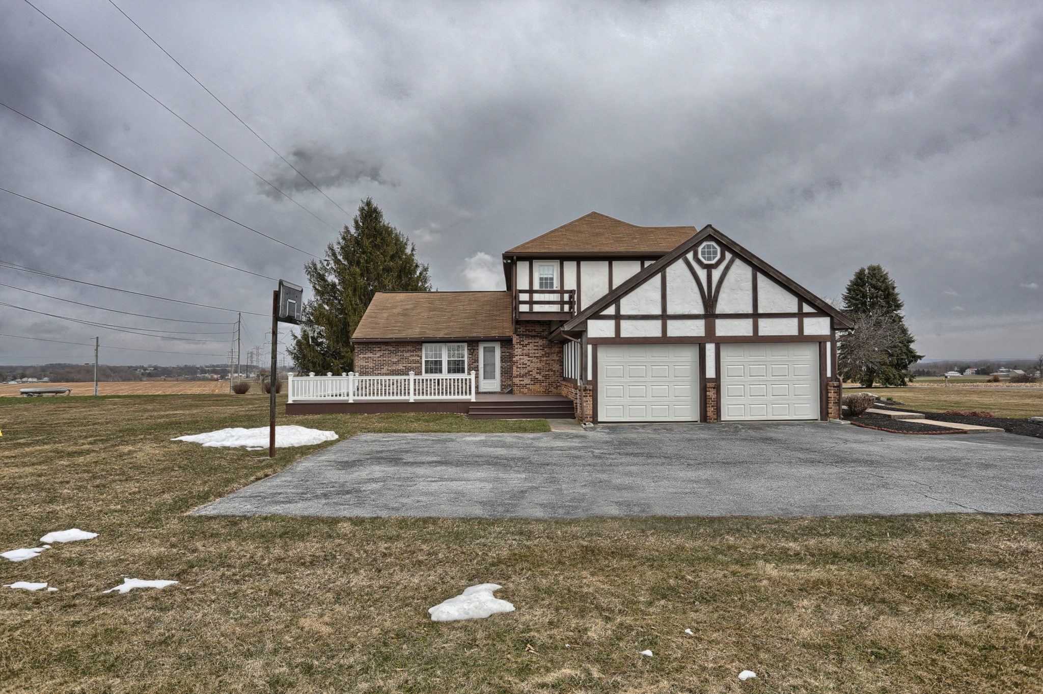 This is a unique Tudor-style home with over 2400 square feet of living space nestled on 1.13 acres with farm land in front and behind. The main floor features a remodeled kitchen with tiled backsplash, Quartz counters, double wall oven, attached dining area, amazing amounts of storage and a view of the backyard and spacious family room. From the kitchen step down into the heart of the home, the daylight filled family room featuring cathedral ceilings and dual oversized storage/office/craft areas with integral closets and access to the deck and backyard. Walk through to the front living room featuring fireplace with raised stone hearth and wooden mantel and abundant natural light. First floor also features a full bath and large front hall closet.