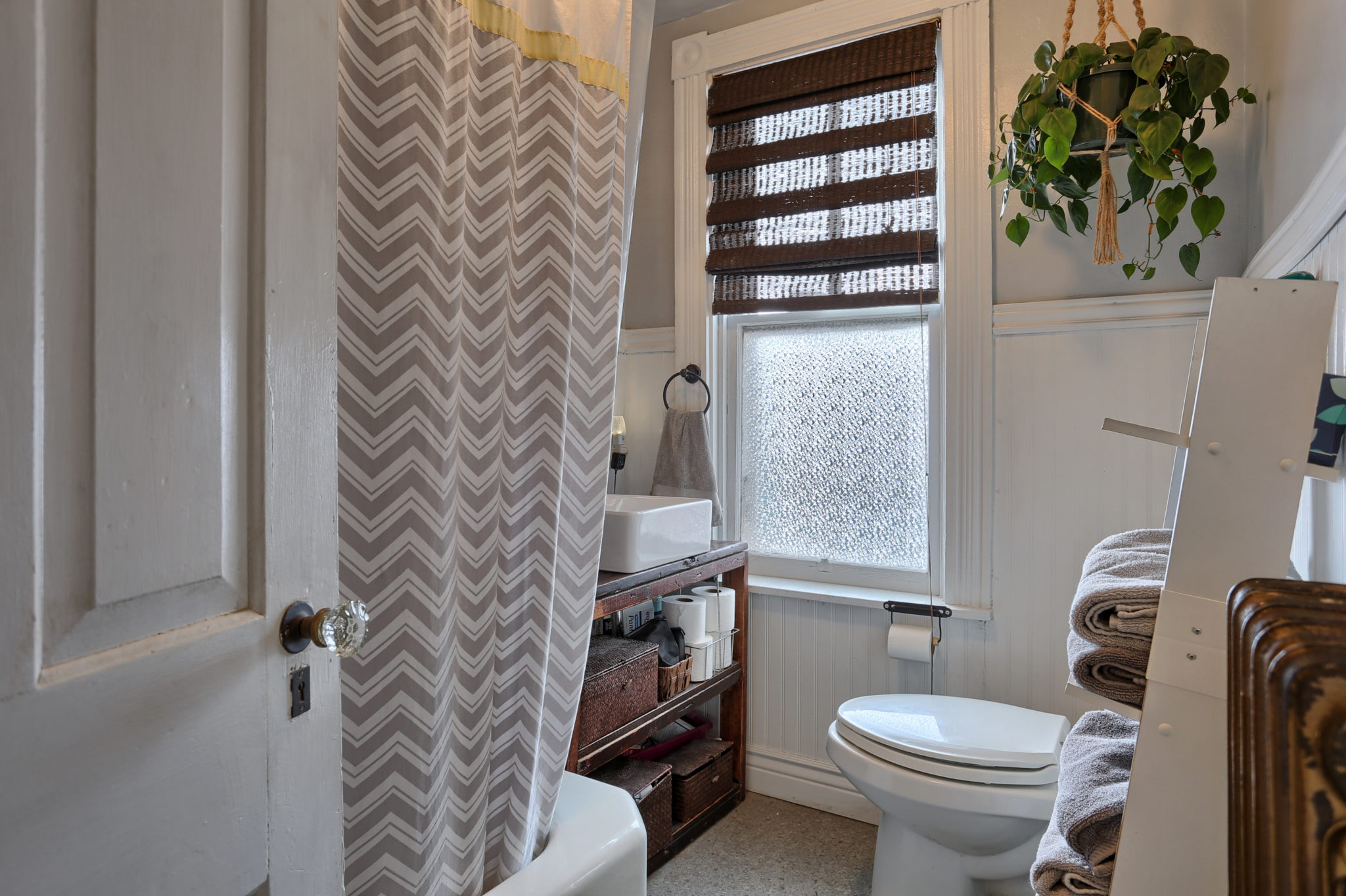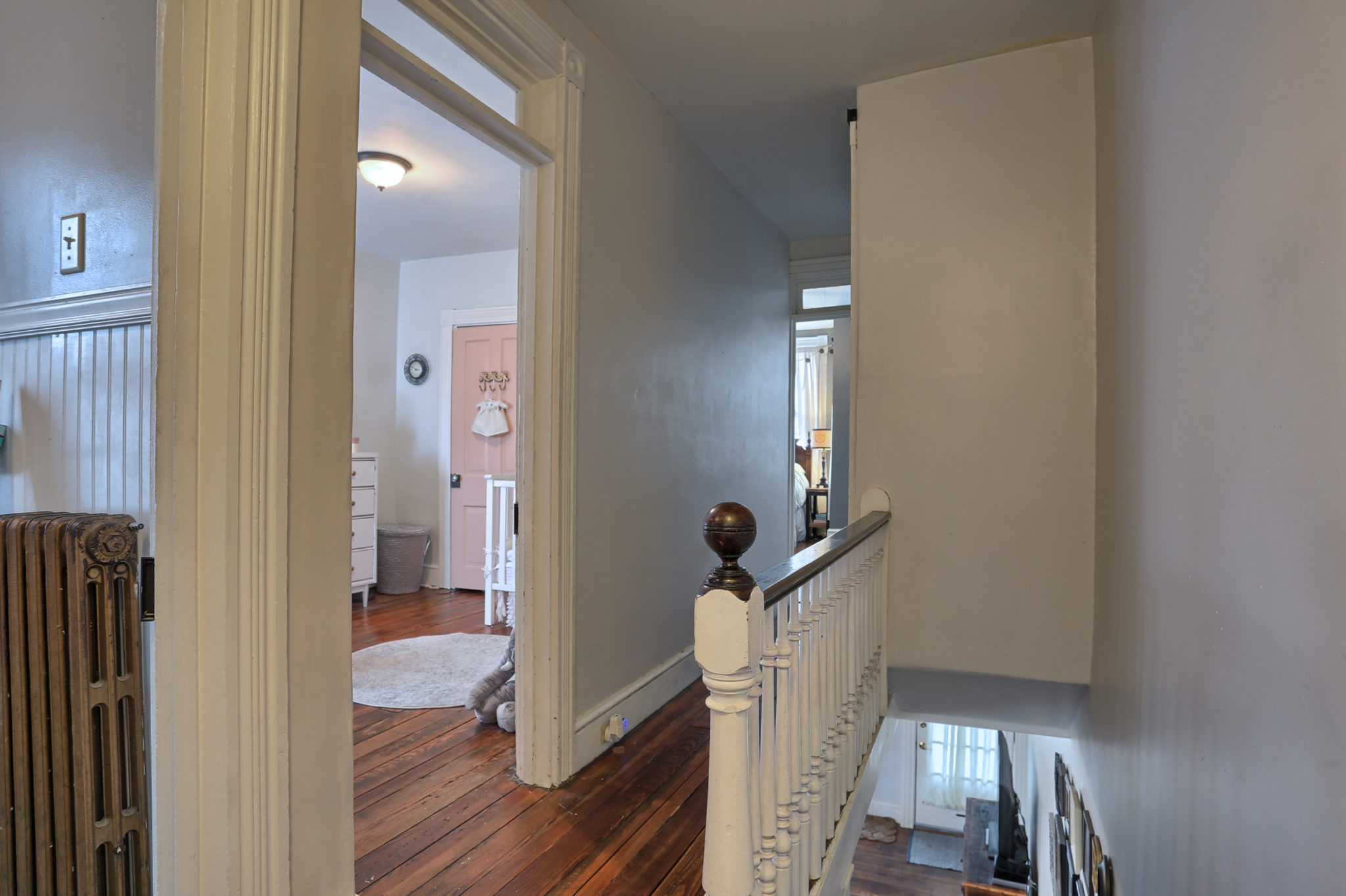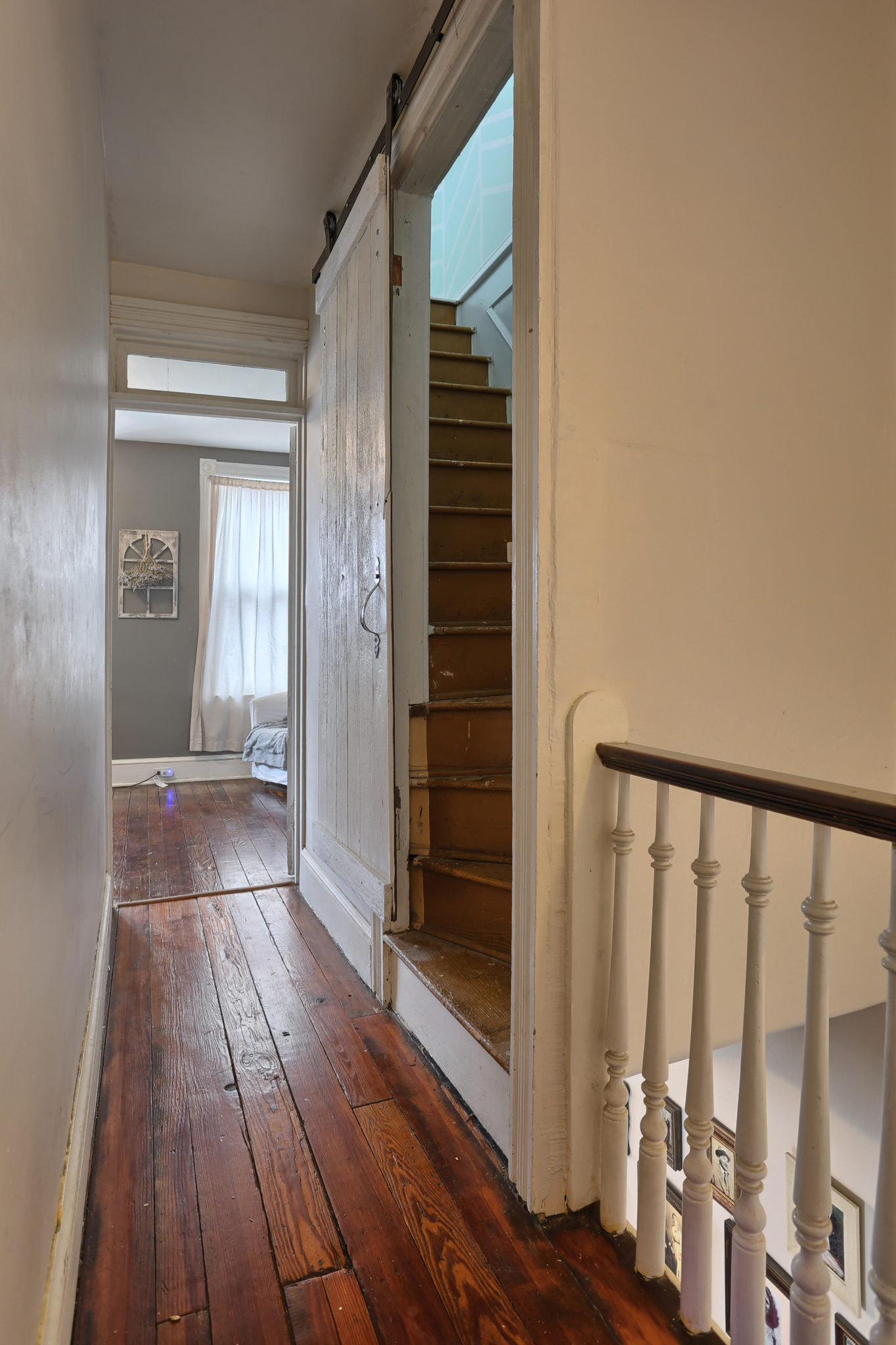 The character continues upstairs with 3 bedrooms boasting natural pine wood floors and balcony access from back bedroom. Sliding barn door leads to finished attic for spacious 4th bedroom.